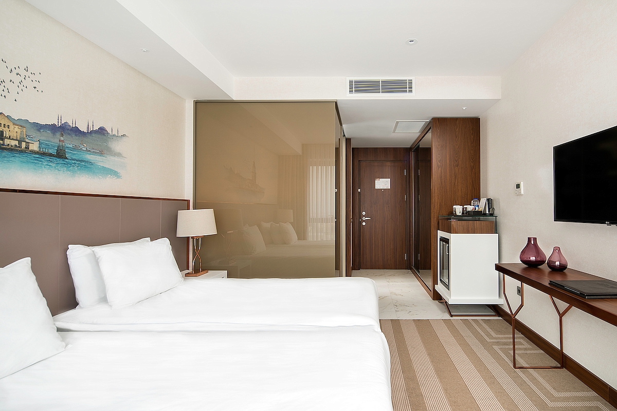 Operasyonel ihtiyaçlar planlanarak hayata geçirilen 10 + 4 katlı binanın tamamı cam giydirme. Maslak?tan Haliç?e oradan Bakırköy?e uzanan Marmara Denizi?ni de içine alan harika bir panoramik manzaraya sahip olan otelimizde, minimum 30 m² den başlayan altı farklı kategoride yüksek tavanlı 231 misafir odamız bulunuyor.
