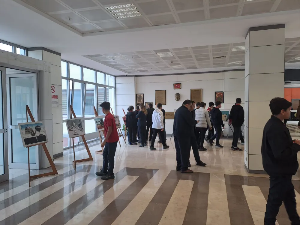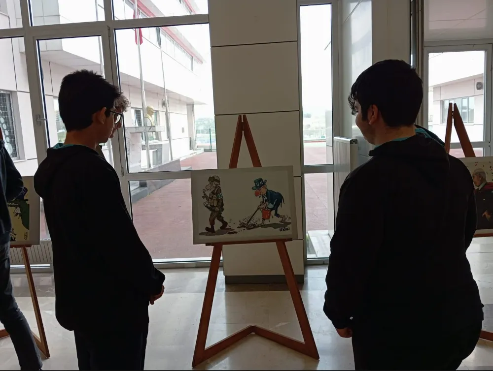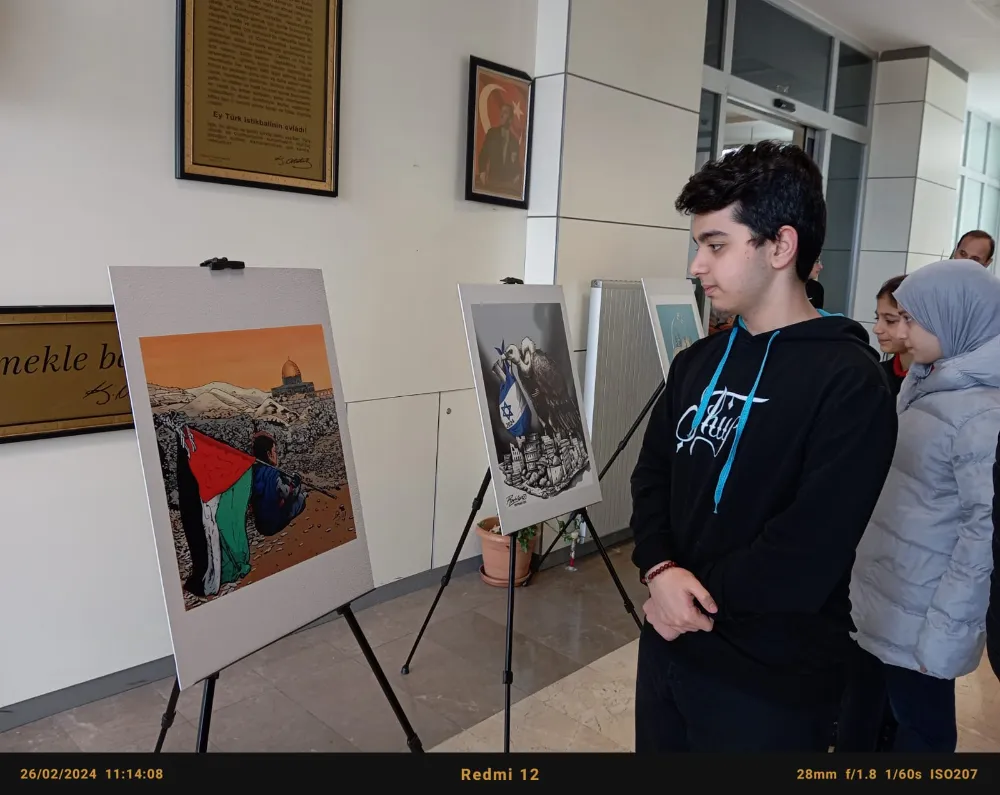 İlçede bulunan 15 Lisede Gazze’deki Siyonist soykırıma dikkat çeken Kudüs Davası Bilincini canlı tutacak Karikatür Sergisinin farkındalığı sürekli hale getirmek, sanat diliyle de ifade etmek amacıyla birbirinden anlamlı 30 eserden oluşan Karikatür Sergisinin ilki Şehit Halil İbrahim Yıldırım Anadolu İmam Hatip Lisesinde Gerçekleşti.