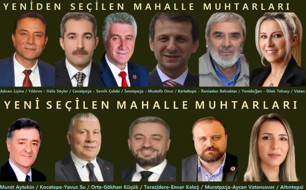 Yıldırım Mahalle Muhtarı Adnan Liçina, İsmetpaşa Mahalle Muhtarı Semih Çelebi, Cevatpaşa Mahalle Muhtarı Halis Söyler, Yenidoğan Mahalle Muhtarı Ramadan Bayraktar Kartaltepe Mahalle Muhtarı Mustafa Onur ve Vatan Mahalle Muhtarı Dilek Teksoy Rakiplerine Karşın Yerlerini Korurken, Uzun Yıllardır Muhtarlık Görevlerini Sürdüren, Kocatepe Mahalle Muhtarı Ahmet Gül’ün Yerine Murat Aytekin , Altıntepsi Mahalle Muhtarı Selahattin Beyler’in Yerine Aycan Vatansever, Terazidere Mahalle Muhtarı Başkim Kosova’nın Yerine Gökhan Küçük , Yeniden Aday Olmayan Muratpaşa Mahalle Muhtarı Seyit Keleş’in Yerine Enver Keleş ,Yine Yeniden Aday Olmayan Orta Mahalle Muhtarı Hilmi İnan’ın Yerine Yavuz Su Seçildi. Gazetemiz Adına Yeni Seçilen Yeni Muhtarlarımızın Yeni Görevlerinin Hayırlı Olmasını Dileriz.
